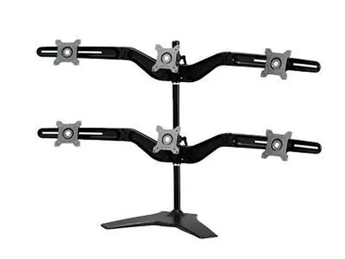 General InformationThis incredibly versatile product supports up to Six 24" monitors each with a maximum individual weight of 13.2 lbs. Not only will this strong and sturdy mount have no trouble holding VESA certified 75x75 or 100x100 monitors, (fitting the above criteria), it is also extremely adjustable! Each monitor can be placed at a different height to accommodate different sized monitors All six monitors have 360 rotation (meaning landscape, portrait, or anything in-between) Also included is a +/- 20 tilt in any direction Individually for ALL 6 Monitors, ensuring maximum user comfort Height adjustable, with a maximum height of 27.75" from the desk to the center of the top VESA bracket. All of these factors compliment each other in providing you with the optimal mounting experience! Benefits of Stand Mounting: This type of mount is the classic desk stand. Maneuverable and reliable, stand mounts are the most popular mounting choice for monitors. Can be moved around your desk, no unscrewing necessary Reliable; most people rely on stands to support their monitors No need for a desk lip to mount onto like clamp based mounts Technical InformationNumber of Displays Supported: 6Display Type Supported: Flat PanelMaximum Screen Size Supported: 24"Maximum Load Capacity: 13.23 lbFeatures: TiltFeatures: SwivelFeatures: RotateFeatures: RuggedFeatures: Multiple Viewing AngleFeatures: LightweightFeatures: Cable ManagementFeatures: Adjustable TorquePhysical CharacteristicsVESA Mount Standard: 75 x 75VESA Mount Standard: 100 x 100Color: BlackMaterial: Aluminum AlloyMaterial: PlasticMaterial: SteelForm Factor: DesktopHeight: 30"Width: 51.2"Depth: 12.1"Weight (Approximate): 21.03 lbMiscellaneousAdditional Information: Easy InstallSmart Torque Adjust+/- 20 degree tilt in any directionArms Rotate 360 Degrees About the Central PoleSmart Cable ManagementCompatibility: 6 x LCD/LED MonitorCountry of Origin: TaiwanTAA Compliant: YesWarrantyLimited Warranty: 3 Year