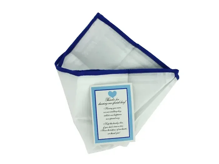 Hand these personalized handkerchiefs to your guests as a heartfelt reminder of your wedding day. Perfect for dabbing away joyful tears, these handkerchiefs come elegantly trimmed in blue.