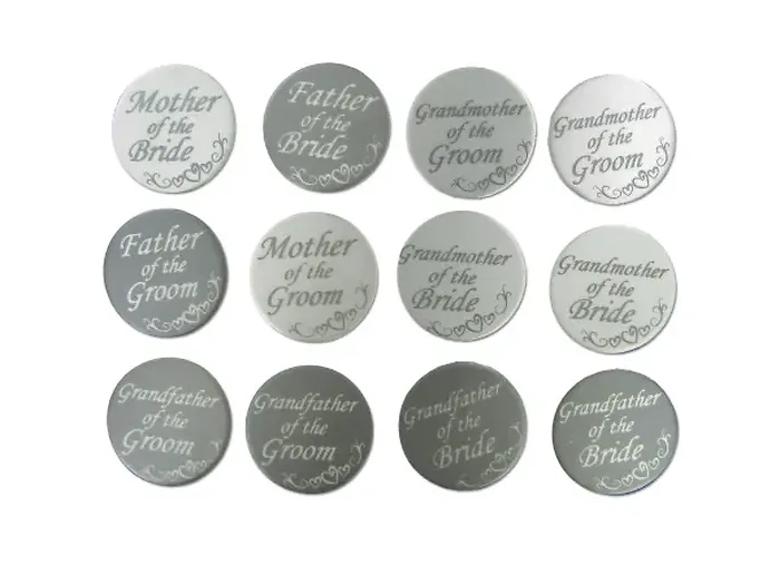 This set includes individual buttons for important family members: one each for the father of the groom, mother of the groom, father of the bride, and mother of the bride. Additionally, there are two buttons each for the grandfathers and grandmothers of both the bride and groom. Each button is crafted with care to highlight the love and unity of your family on this joyous occasion.
