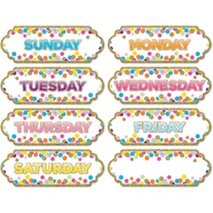 Large Die-Cut Magnetic Confetti Days of the Week Timesavers simplify your decorating and organizing. Use as headers on your magnetic whiteboards, lockers, refrigerators and other steel surfaces. Write names, goals, assignments, lists and more underneath each day. Bold, colorful lettering in all caps cannot be ignored. One header is blank for you to customize and update. Confetti style matches well with coordinating decor. Die-cut pieces easily punch out from the 8-1/2" x 11" sheet. Use write-on/wipe-off surface with dry-erase markers.