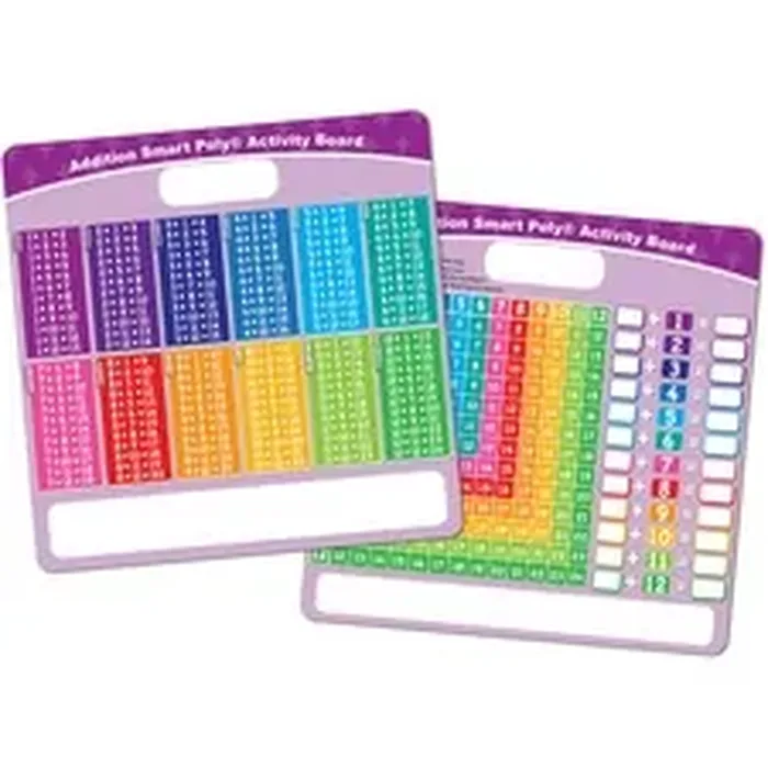 Addition Smart Poly Busy Board helps children learn their addition tables from 1 to 12. One side of the colorful, dry-erase board shows addends and their sums in rows grouped by the first number. The other side showcases a full addition table along with a worksheet column where students can write in an addend and then the resulting answer. Both sides include blank sections for practice and notes. Perfect for reusable learning anywhere, the write-on/wipe-off surface lets you write directly on the board and quickly wipes clean for your next session. Use with dry-erase or water-based markers and washable crayons. No lamination is needed. Heavy-duty cardboard coated with poly material is designed to be long-lasting, easy to clean and water-resistant for many years. Carry easily with the die-cut handle. Durable board includes a black, dry-erase marker (fine point).