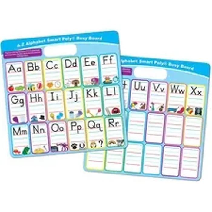 ABC Fill In Smart Poly Busy Board helps children learn to write their letters for interactive play and educational development. Perfect for reusable learning anywhere, the write-on/wipe-off surface lets you write directly on the board and quickly wipes clean for your next session. Use with dry-erase or water-based markers and washable crayons. No lamination is needed. Heavy-duty cardboard coated with poly material is designed to be long-lasting, easy to clean and water-resistant for many years. Carry easily with the die-cut handle. Durable board includes a black, dry-erase marker (fine point).