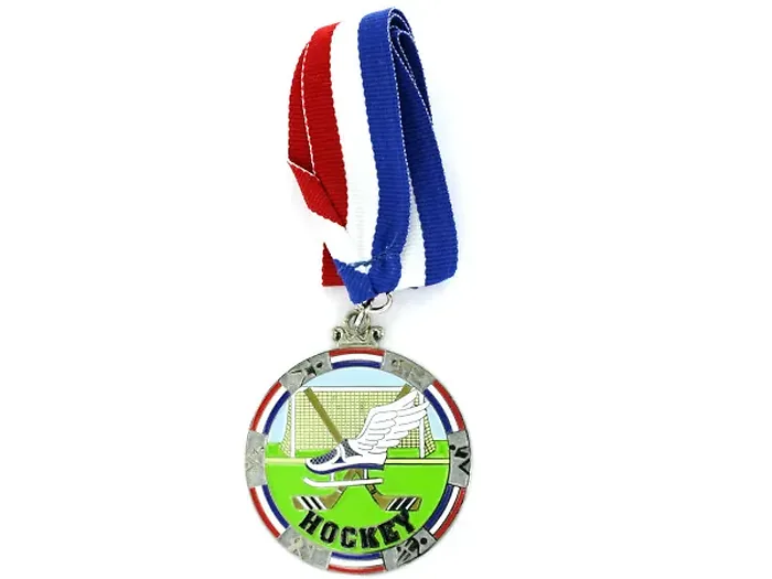 Honor your hockey players with our Customizable Hockey Enamel Award Medal. This 2" diameter metal medallion is perfect for recognizing outstanding performances, sportsmanship, or team spirit. Each medal comes with a stylish 30" striped ribbon, making it a standout trophy in any collection.