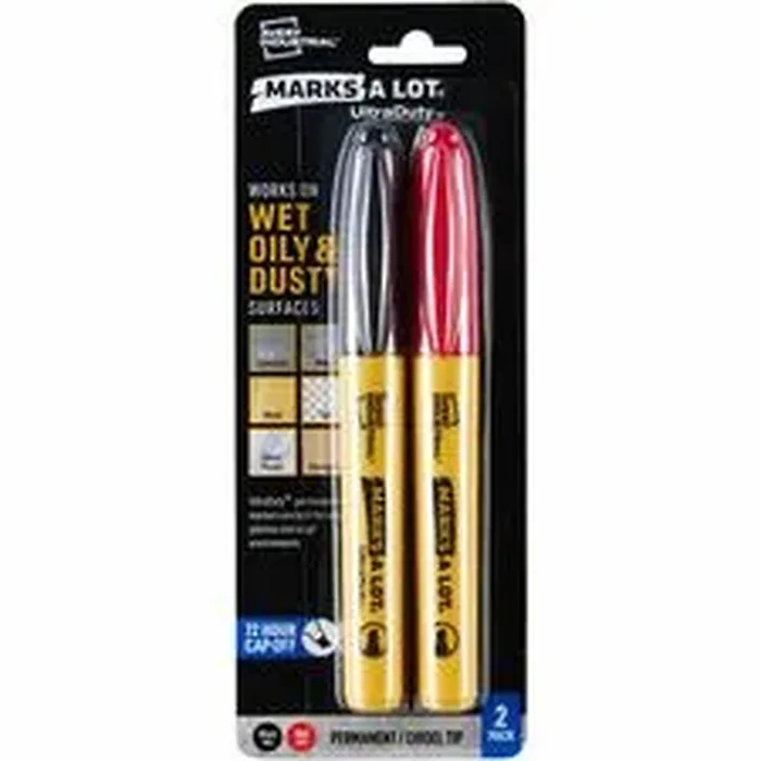 Get the job done with this 2 pack of Avery 29863 Marks A Lot UltraDuty markers with chisel tips. Built for situations where standard permanent markers just aren't enough, Avery Marks A Lot UltraDuty markers are perfect for construction sites, warehouses, workshops and more. The bold fast-drying ink works great on plastic, wood, metal, corrugate and concrete. The durable 5mm bullet tip also works on abrasive, dusty, wet and oily surfaces without clogging. The angled chisel tip also allows you to write lines in varying widths to switch from narrow to bold on the spot. Specially engineered to resist water, abrasion and smearing, the heavy duty ink makes sure that your writing will last through even the harshest of conditions. The durable ink is designed to last and won't dry out when the cap is left off for up to 72 hours. The cap also features a useful clip to help keep the markers secure in your pockets and to prevent rolling. Includes 1 black marker and 1 red marker. Please Note: The industrial-grade ink has a stronger odor than traditional permanent markers.