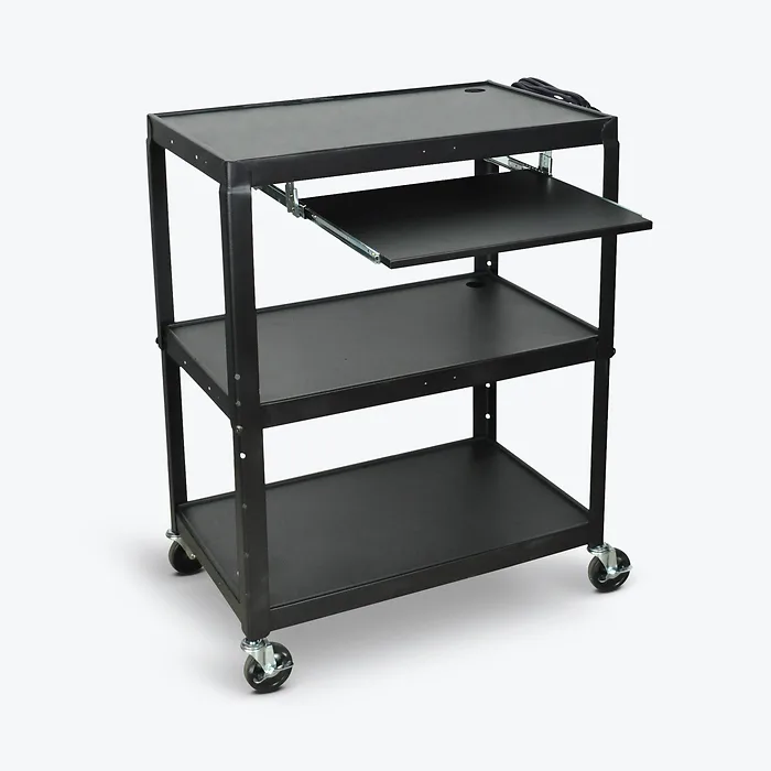 The Luxor Extra Large Adjustable-Height Steel Cart gives you more sturdy space for your AV equipment needs. Each of the three spacious shelves measures 32"x 20" and has a retaining lip to help keep contents in place. There's also a pullout tray that's perfect for laptops or keyboards. The frame and shelves are constructed from roll-formed steel with a powder coat painted finish for lasting durability. An integrated outlet and cable pass-through cutouts help organize your electrical needs, and full-swivel 4" casters with two locking brakes make the cart easy to move or quickly secure in place.