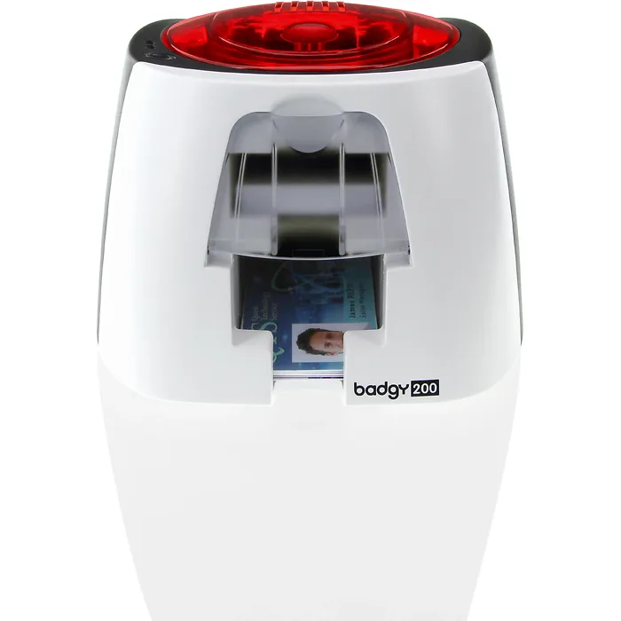 General InformationBadgy200 is a step up from the Badgy100 It is a userfriendly solution to create and print plastic IDs at your own desktop for students employees members events and more The Badgy200 is ideal for small and medium sized organizations that need to print in volumes up to 1000 or more cards per year Some of the profesional features included are edgetoedge printing and the ability to import a database among other features You can print tamperproof customized badges with your own photos logos text barcodes and even QR codes Badgy200 comes complete with a printer Evolis Badge Studio ID design software for PC ampamp Mac 100 print color ribbon 100 free cards and cables Technical InformationRecommended Use Card PrintPrint Color ColorPrinting Capability Single SidedMaximum Mono Print Speed 17 SecondMaximum Color Print Speed 40 SecondMaximum Print Resolution 300 dpiBar Code Symbology Supported Code 39Bar Code Symbology Supported Code 128Bar Code Symbology Supported Interleaved 2 of 5MemoryStandard Memory 16 MBInterfacesPortsUSB YesMedia Types ampamp HandlingMedia Type CardMedia Type PVC CardMedia Type Laminated PVCMedia Type PVC CompositeMedia Type PET CardMedia Type Business CardMedia Size 338ampquot x 213ampquot CR80 CardMedia Handling Feeder 100 CardMedia Handling Output Hopper 10 CardMedia Thickness 1969 milSoftwareOperating System Supported Windows XP SP3 Vista 3264 W7 3264 W8 3264 Mac OS X Power DescriptionPower Source Power AdapterInput Voltage 24 V DCPhysical CharacteristicsForm Factor DesktopHeight 65ampquotWidth 76ampquotDepth 107ampquotWeight Approximate 529 lbMiscellaneousPackage Contents Card PrinterColor Ribbon YMCKO for 100 cards100 Blank PVC cards 050 mm 20 milCleaning KitInstallation CD Printer Driver Software And Card TemplatesPower Supply And CordUSB CablePlatform Supported MacPlatform Supported PCCertifications ampamp Standards CEFCCVCCICCCWarrantyLimited Warranty 1 Year