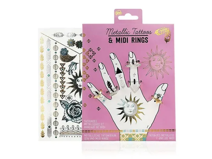 Transform your hands into a stunning work of art with the Dazzling Metallic Tattoo Kit featuring a collection of beautiful tattoos and stylish rings. This set includes one sheet of metallic tattoos showcasing various designs such as elegant feathers, vibrant flowers, radiant suns, tropical plant leaves, and intricate tribal patterns.