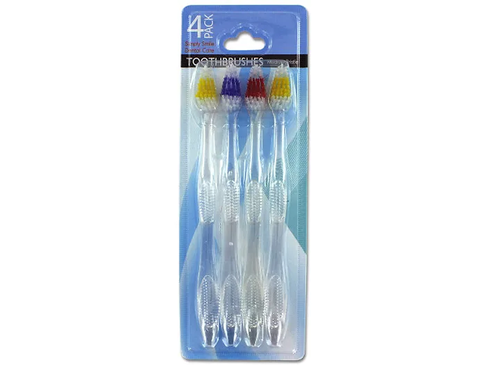 Perfect for gentle yet thorough cleaning, this 4-piece Medium Bristle Toothbrush Set features clear acrylic curved comfort grip handle toothbrushes. Handles designed to be large at the palm grip and narrow for the fingers grip. The triangular shaped head has round end and white nylon bristles that are waved for longer outside length where needed. The colorful centers are blue, green, red and yellow for identification. The full length is approximately 7 1/4" and the head is 1 3/16" long with a 7/16" bristle length. Comes packaged in a blister pack.