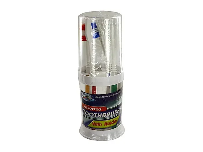 This stylish toothbrush holder includes four assorted color toothbrushes designed for effective cleaning. Each toothbrush features round bristles for gentle yet thorough care of your teeth. The set comes shrink wrapped for your convenience, and the holder is designed to keep your toothbrushes organized while also adding a touch of elegance to your bathroom.