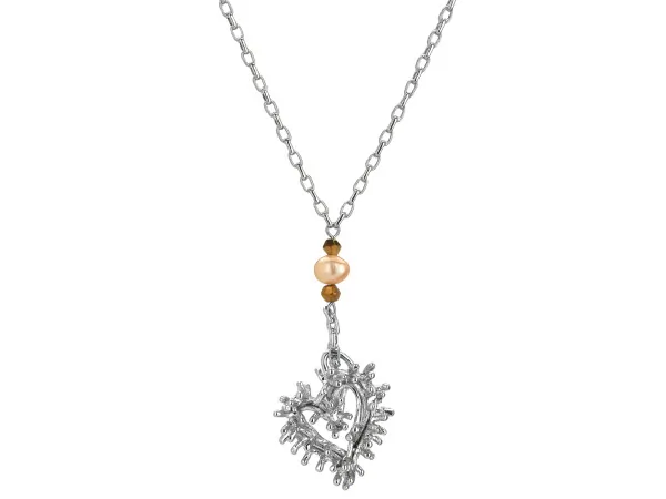 This beautifully crafted silver heart necklace combines elegance and whimsy. The single strand design features alternating topaz glass beads, bronze spacers, and pink fresh water pearls, all elegantly displayed on a modern chain link. A standout feature is the charming spiked metal heart pendant, which boasts a center topaz bead for added sparkle.