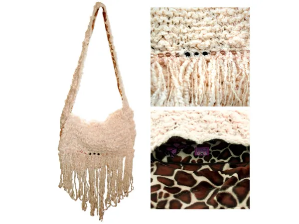 This one-of-a-kind fanny pack is crafted from soft shredded brown, cream, and tan cotton, and features a secure zipper closure. The interior is lined with a durable brown fabric to keep your items safe. The front showcases four elegant brass crucifixes for a touch of artistic flair. Measuring approximately 10" x 5 1/2", with a waist strap that extends to 24 1/2", this bag is adjustable for the perfect fit.