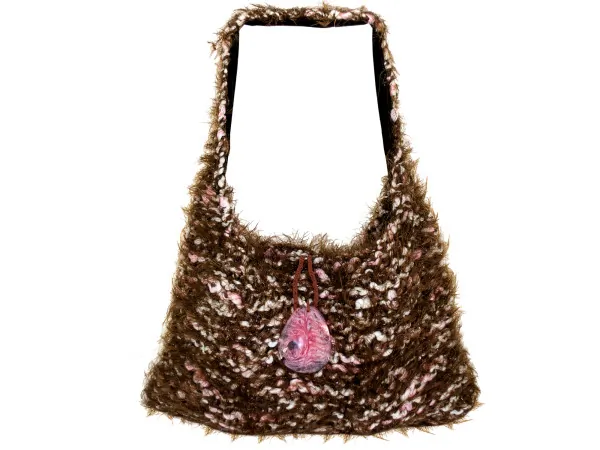 Each bag is crafted from soft brown yarn and fully lined with luxurious chocolate velvet. It features a small inner pocket for organizing loose items, a secure magnetic snap closure, and an additional closure that loops around a stylish pink glass stone. This bag measures approximately 15 inches wide, 10 inches tall, with 10.5-inch straps, and the decorative cross detail measures 3.5 inches tall by 2.25 inches wide.