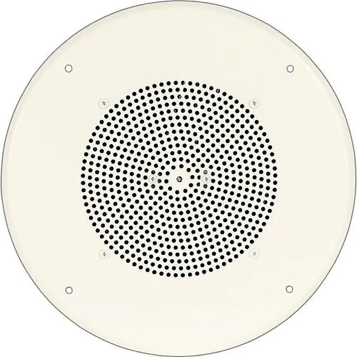 The speaker includes an off-white or bright white steel grille, pre-assembled for quick installation and compatible with both 70V and 25V amplification systems.