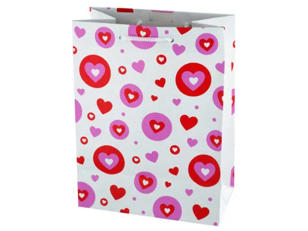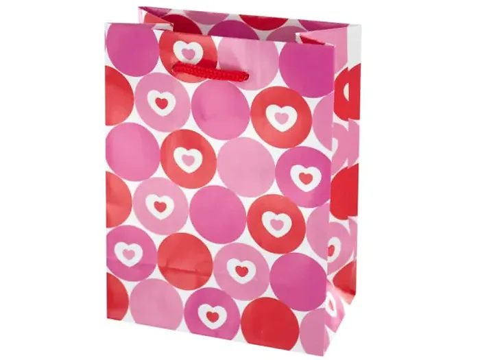 Surprise your loved ones with this charming Hearts & Dots Valentine's Day Gift Bag. The bag features a delightful semi-gloss finish adorned with a playful pattern of pink and red dots and hearts. Equipped with sturdy red woven handles, this gift bag is perfect for presenting sweets, small gifts, or heartfelt notes on a special day.