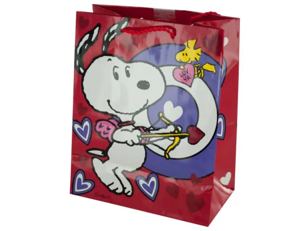 Perfect for Valentine's Day, this Snoopy Bullseye Valentine's Gift Bag features a glossy paper bag with a fun print of Snoopy and Woodstock with a bullseye, the words "LUV YA!", glitter hearts and twisted red handles. Measures approximately 7.75" x 4.25" x 9.625". Comes loose.