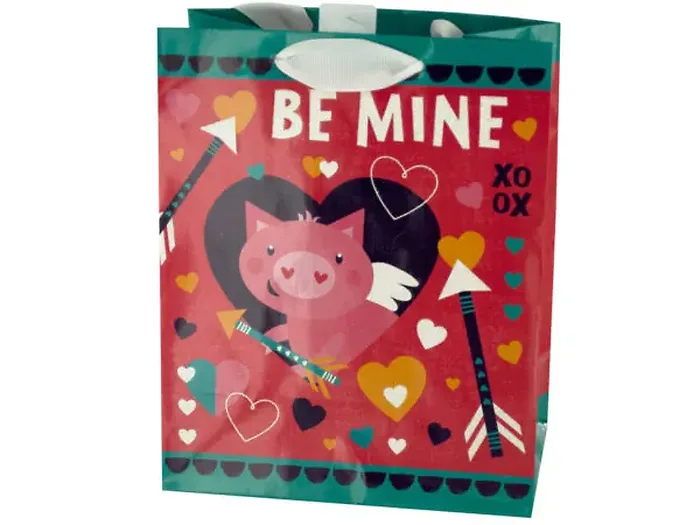 Make someone special smile with this adorable Valentine's Cupig 'Be Mine' Gift Bag. It features a glossy paper design adorned with a cute pig and the sweet message "Be Mine," complete with glitter accents and elegant white ribbon handles.