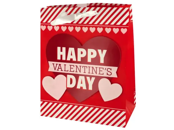 Celebrate love with our Happy Valentine's Day Striped Gift Bag. This beautifully designed matte red bag features a delightful cardstock heart cutout that reads 'Happy Valentine's Day' and is adorned with charming stripes and hearts. With white ribbon handles, this gift bag is not only stylish but also practical for carrying your thoughtful gifts.