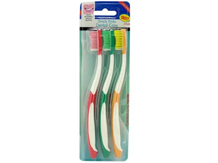 Experience gentle cleaning with our Comfort Grip Toothbrush Set. This set includes three medium bristle toothbrushes designed for optimal comfort and effectiveness. The bristles are precisely angled to reach challenging areas, ensuring a thorough clean for both teeth and gums.