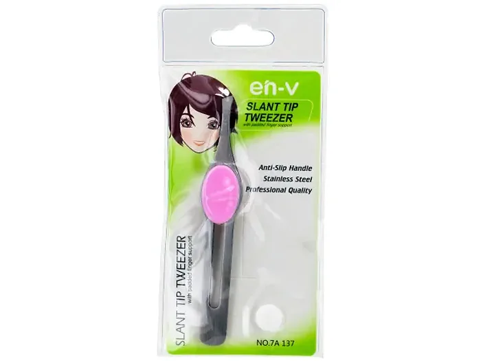 This ergonomic slant tip tweezer features a wide grip handle with padded finger support, ensuring greater control and accuracy while tweezing. The precision slanted tip is designed to effectively reach those hard-to-reach hairs, making grooming easier than ever. Comfort pads come in assorted colors, including pink, black, and blue, adding a touch of style to your beauty tools.
