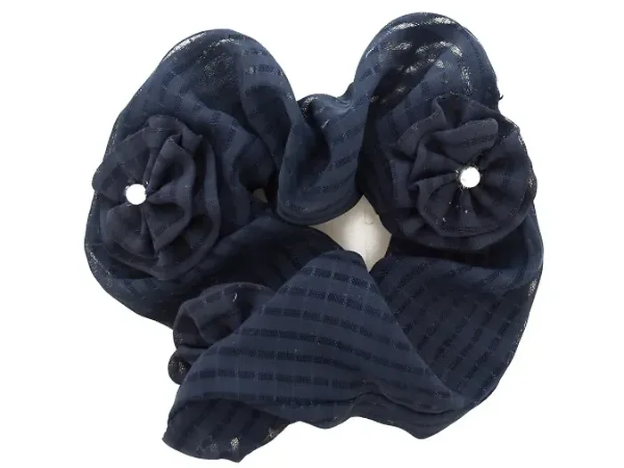 The Navy Chiffon Ruffle Hair Twister is perfect for adding a touch of elegance to any hairstyle. Designed for all hair types, this hair accessory features a lovely semi-sheer navy blue chiffon with delicate ruffles and charming pearl accents, making it a stylish addition to your look.