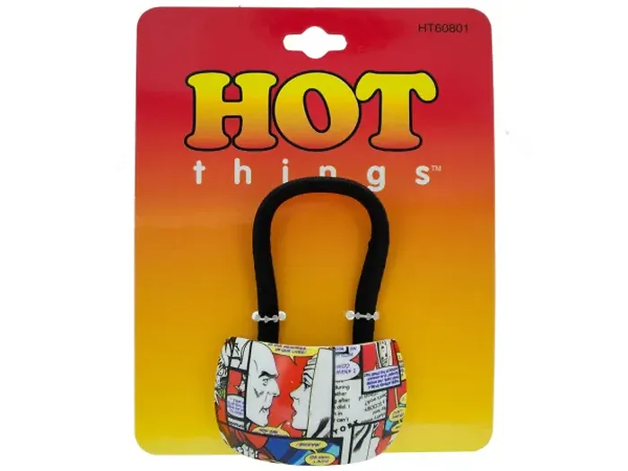 Add a splash of personality to your hairstyle with our Comic Book Art Themed Ponytail Holder. Designed for all hair types, this vibrant ponytail holder features a curved plastic piece adorned with colorful comic book illustrations, securely attached to a durable black stretchy hair band.
