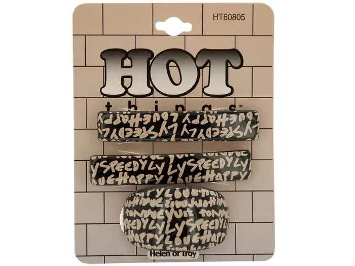 Add a playful touch to any hairstyle with the Fun Word Art Hair Clips and Ponytail Holder Set. Crafted for all hair types, this unique 3-piece set includes stylish clips and a ponytail holder featuring uplifting words. The hair clips are adorned with cheerful phrases like 'happy' and 'love', while the ponytail holder highlights word art on a curved plastic piece. Perfect for expressing your personality, this set is available in a variety of vibrant colors and comes neatly packaged on a hanging panel for easy display.