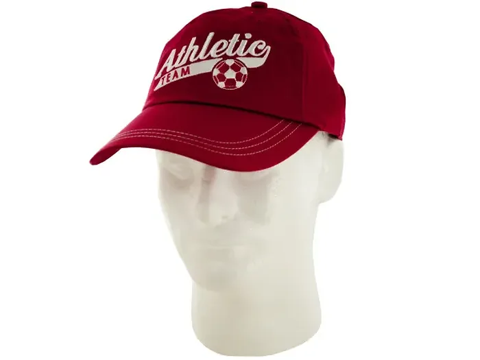 This vibrant Boys Red Soccer Team Cotton Baseball Cap is perfect for aspiring athletes and active kids. It's designed for comfort and style, making it ideal for sports, casual outings, or just keeping the sun at bay. The cap is crafted from 100% cotton and features a relaxed fit with playful white embroidery showcasing the words 'Athletic Team' alongside a stylish soccer ball. Packaged with a convenient hang tag for easy display.