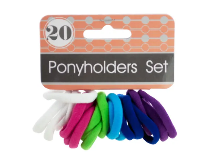 Ideal for workouts, casual styles and pony tails, this 20-piece Colored Clasp Free Ponyholders Set features strong, stretchy bands in a variety of colors and white, making them the perfect accessory for any outfit. Bands have a comfort fit, no clasps and retain elasticity. Comes packaged with a hanging panel.