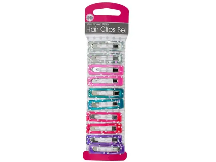 Add a touch of sparkle to your hairstyle with our Iridescent Mini Flower Glitter Hair Clips. This set includes 10 enchanting clips, perfect for both casual and special occasions. Each clip features a jelly-look design adorned with beautiful flower glitter, providing an eye-catching finish that secures your hair stylishly. Measuring approximately 1.5 inches long, these clips are easy to use and come ready for display on a hanging panel.