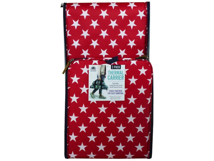 Hot or cold, take your culinary delights on the go! These attractive insulated food carriers stack, making them easy to pack and carry. The stacked carriers have a fun patriotic design in red and white. Great for potlucks, picnics, and parties. Larger carrier fits 10"x15" dish, smaller carrier fits a 9"x9" dish. Carriers have a hook and loop closure on the handles on both bags allowing them to be carried vertically while keeping your food safe. Each carrier has a therma-flect radiant barrier, microban lining. Comes packaged together with a polybag and hangtag inside a brown box. Approximate measurements: Large carrier is 10.25" x 11.5" x 4" and small compartment is 13.75" x 11" x 4.25".
