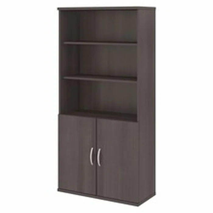The Bush Business Furniture Studio C 5 Shelf Bookcase with Doors looks great, works hard and adjusts to fit the needs of your office. Designed with two fixed and three adjustable shelves, the Bookcase holds your books and reference materials with plenty of room for your favorite decorative accents. Confidently store a variety of items on the spacious and durable shelves, designed to hold up to 50 lbs each. A thermally fused laminate finish fends off everyday damage like scratches and stains throughout years of everyday use. The doors conceal your office supplies and add an eye-catching touch to your workspace. With attractive Brushed Nickel hardware, doors cover the two lower shelves and feature self-closing Euro-style hinges for an easy open and shut. This bookshelf features a classic design that comes in your choice of several contemporary or traditional finishes to fit in any workspace. Purchase a set of Bookcases to build a complete storage wall that organizes your office and expresses your style. This tall Bookcase with Doors comes with a 10 Year Warranty and meets ANSI/BIFMA quality test standards. See the full collection for coordinating items available to make your office your own with Studio C. American made with U.S. and imported parts.