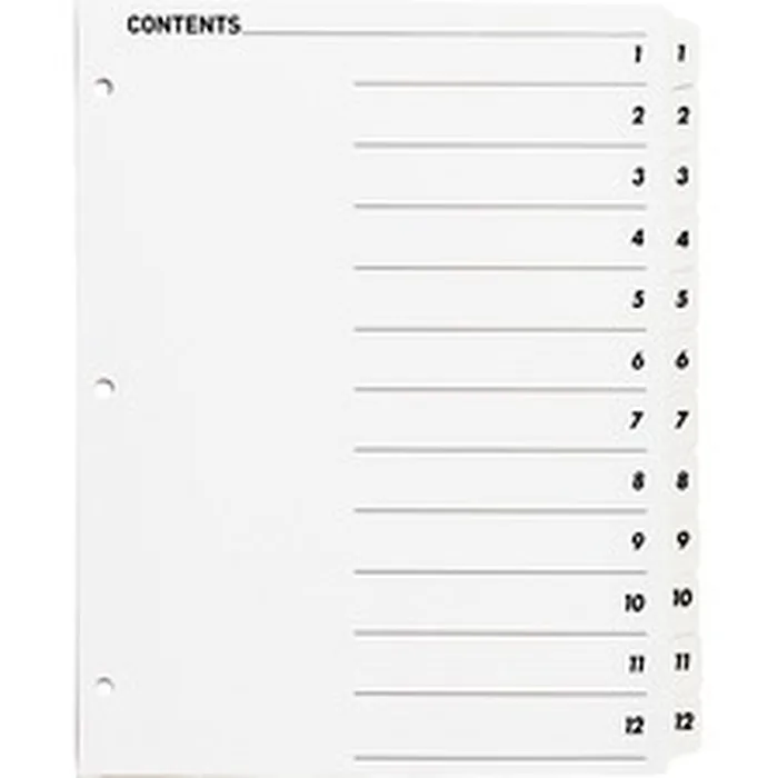Make organization quick and easy using a black/white Table of Contents page that coordinates with included dividers with numbered tabs. Key in or type section titles and then print or copy onto the Table of Contents page preprinted with numbers that match the dividers. Edges and white tabs feature Mylar reinforcement to prevent tearing. Three-hole punched edges allow easy, quick placement into standard-size, three-ring binders. Index dividers are compatible with all laser and inkjet printers and include easy-to-follow instructions.
