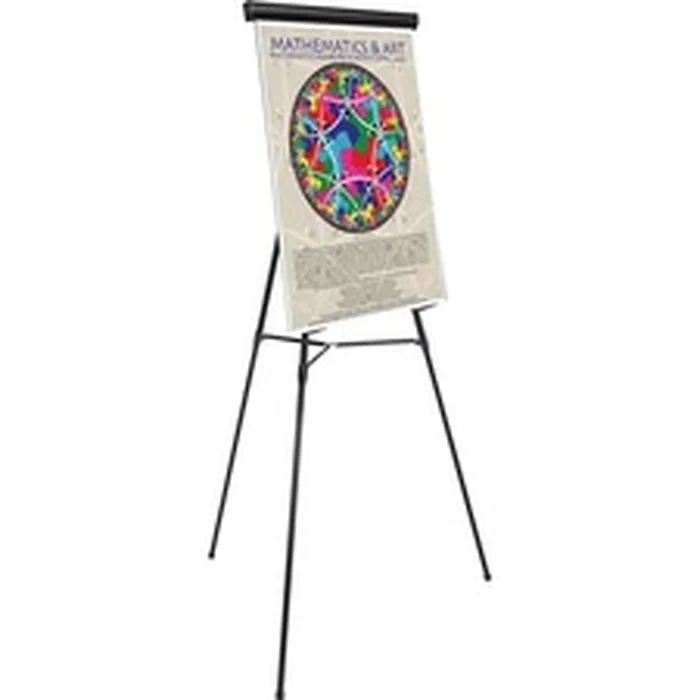 Heavy-duty display easel can hold any size easel pad with its full-width, no-pinch pad retainer that easily snaps off and on. Metal easel also adjusts in height from 37-1/2" to 69" for tabletop or floor display. Sturdy telescoping legs feature a heavyweight locking center brace for stability and supports weight up to 45 lb. Adjustable sign holders lock into place. Three-leg display easel also folds easily for storage or transport and features rubber nonskid feet. Legs are made of aluminum. Support arms are made of plastic.