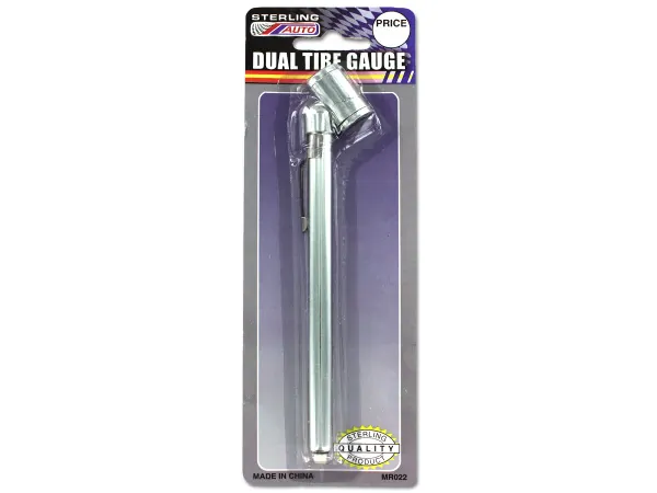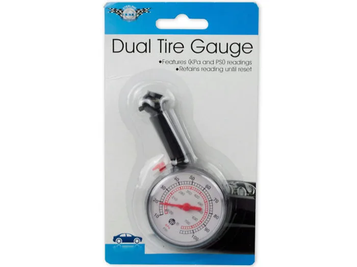 An automobile must-have, this Dial Tire Gauge features durable plastic construction and KPa and PSI readings. Gauge retains reading until reset. Checking tire pressure regularly helps improve gas mileage and reduce tire wear. Measures approximately 3 1/2" long. Nozzle is about 1 3/4" long. Comes packaged in a blister pack.