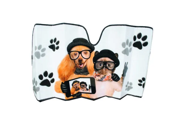 Protect your car's interior and maintain a comfortable cabin temperature with the Dual-Sided Car Sunshade featuring a reflective backing. This versatile sunshade offers two sides: one for maximum heat reflection and the other for stylish design. It measures approximately 57" x 27" and is designed to fit most vehicles. The product comes securely packaged in a hanging poly bag for easy storage.
