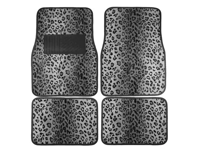 Keep your vehicle's interior clean and stylish with this 4-piece Leopard Print Car Floor Mats Set. These mats feature a trendy gray and black leopard pattern, designed to protect your car's carpet from spills, stains, dirt, and debris. The non-skid nib backings ensure the mats stay securely in place, providing both safety and functionality. The universal shape fits most cars, making these mats a versatile addition to your vehicle.