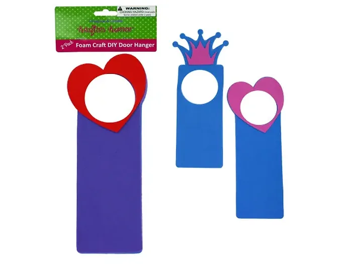 The Creative Foam Door Hanger Craft Kit is perfect for unleashing creativity in both kids and adults. This fun project allows you to design unique and personalized door hangers using the included templates. Each kit contains two door hangers in playful designs—one heart-shaped and one crown-shaped. Ideal for craft time and decoration, these hangers come conveniently packaged in a poly bag with a header card. Please note that this kit is not recommended for children under 3 years old.