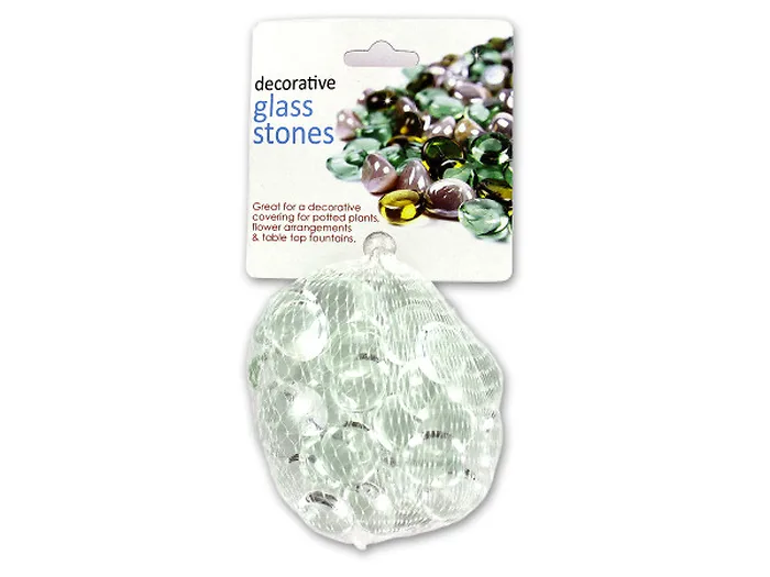 Ideal for covering potted plants, decorating table top fountains, creating unique flower arrangements and more, these Clear Decorative Glass Stones come in a smooth oval shape with flat backs. Each bag comes with approximately 60 stones. Each stone measures roughly 3/4". Entire bag contains around 8 ounces of stones. Comes packaged in a hanging net bag.