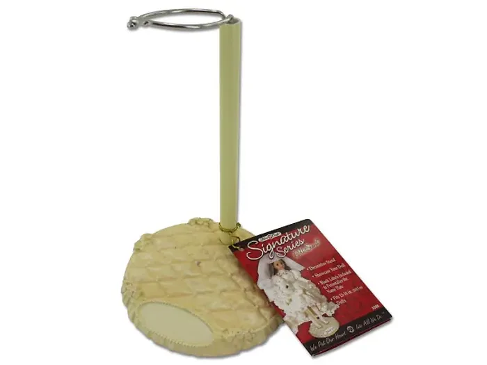 This elegant Victorian doll stand is the perfect way to display your cherished doll collection. Its charming pastel yellow design complements the intricately crafted resin Victorian pillow base. Each stand comes with blank labels for personalizing the name plate, making it a unique addition to any collector's showcase.