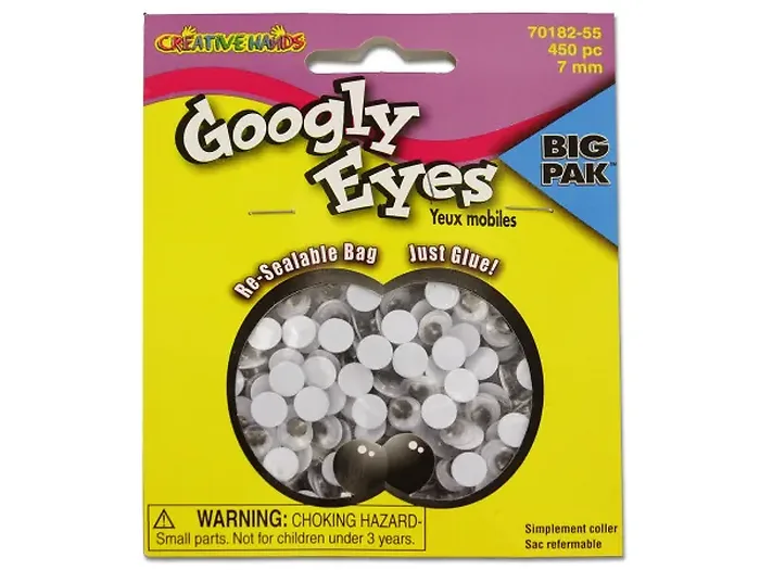 Add some whimsy to your crafts with these Assorted Wiggle Eyes! Perfect for adhering to cards, scrapbooks, dolls, and various art projects, these eyes bring life to any creation. Each pack contains 450 wiggle eyes, allowing you to get creative without running out. They are packaged in a convenient poly bag with a hanging panel for easy display. Please note, these are not recommended for children under 3 years old. Each eye measures approximately 7MM.