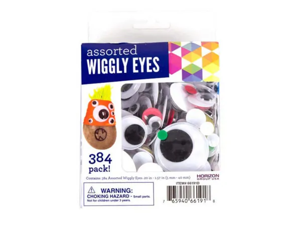 Crafted from durable plastic with a black disk inside, the eyes range in size with approximate diameters of 15/16", 15/32", and 13/32". Ideal for hobbyists and crafters, these wiggly eyes bring projects to life! Please note that they are not recommended for children under 3 years old. The product comes packaged in a poly bag with a header card for easy display.