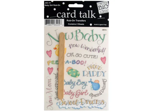 Perfect for scrapbooking, card making or any craft, these charming Baby Boy Rub-On Transfers feature baby-related phrases and a quote in various fonts and designs. Includes two sheets of transfers and an applicator stick. Transfers can be used on paper, wood, fabric and other surfaces. Acid and lignin free. Comes packaged in a poly bag with a header card. Package measures approximately 7.75" x 4.5".