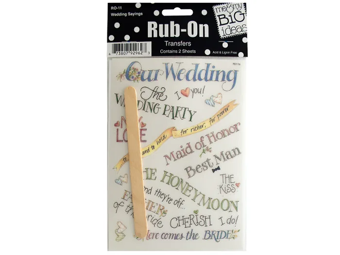 Perfect for scrapbooking, card making or any craft, these fun Wedding Sayings Rub-On Transfers feature various wedding-related phrases and words. Includes two sheets of transfers and an applicator stick. Transfers can be used on paper, wood, fabric and other surfaces. Acid and lignin free. Comes packaged in a poly bag with a header card. Package measures approximately 8" x 4.5".