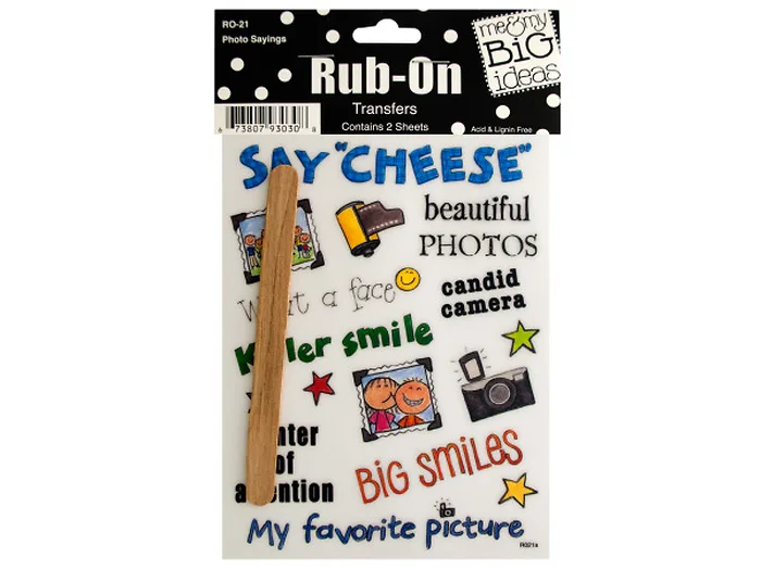 Perfect for scrapbooking, card making or any craft, these fun Photo Sayings Rub-On Transfers feature various photo-related phrases, words and designs. Includes two sheets of transfers and an applicator stick. Transfers can be used on paper, wood, fabric and other surfaces. Acid and lignin free. Comes packaged in a poly bag with a header card. Package measures approximately 8" x 4.5".