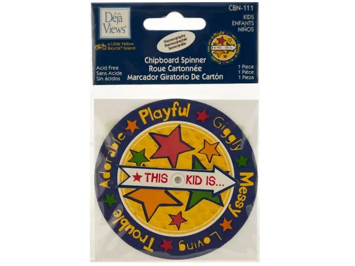 This delightful Fun Spinner Sticker is perfect for adding a playful touch to scrapbooking and craft projects. The sticker features a vibrant round chipboard with a cheerful yellow center adorned with stars. Around the chipboard, you'll find fun descriptive words like "playful" and "giggly", making it a great addition to any child's creations.