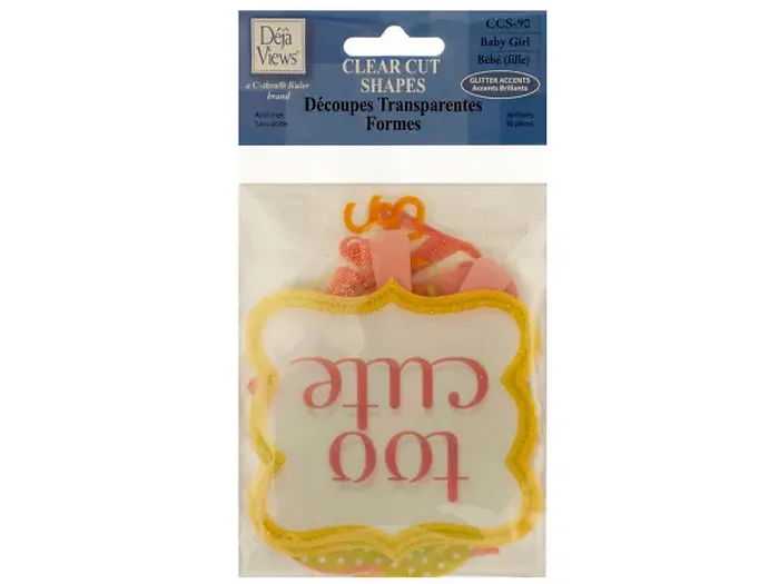 Perfect for scrapbooking, decorating and general craft use, this charming 30-piece Clear Cut Baby Girl Shapes with Glitter Accents Set features decorative transparent shapes and words with a baby girl theme. Includes two of each shape. Variously-sized shapes measure approximately 1" x 2" to 3" x 4". Comes packaged in a poly bag with a header card.