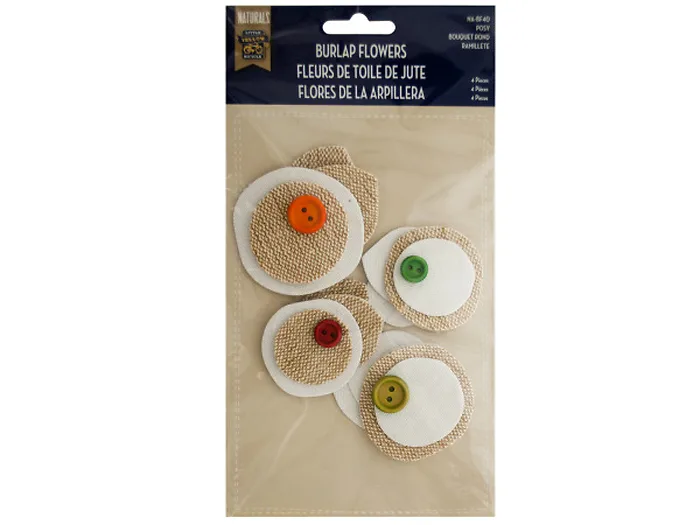 Great for scrapbooking, sewing, decorating and general craft use, this sweet 4-piece Burlap Flowers Craft Embellishments Set features layered fabric flowers with colored wooden button accents. Each piece measures approximately 2" to 2.5". Comes packaged in a poly bag with a header card.