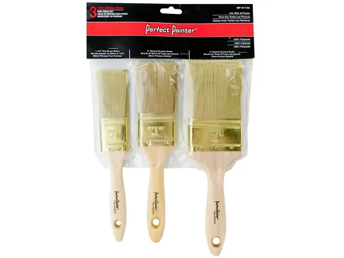This 3-piece Versatile Paint Brush Set is ideal for all types of paint applications. It includes three different sizes to suit your needs: a 1-1/2" trim brush, a 2" general purpose brush, and a 3" general purpose brush. Each brush features high-quality 100% polyester bristles for smooth and even application, complemented by clear-coated wooden handles for a comfortable grip. The set comes neatly packaged in a poly bag with a header card, making it perfect for storage or gifting.