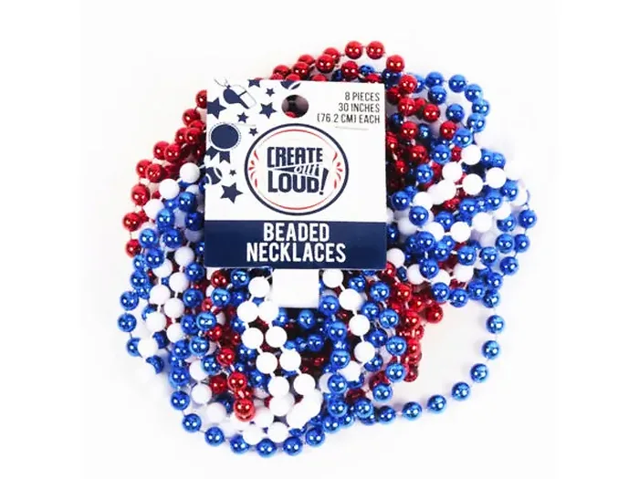 Each necklace is crafted from durable plastic, featuring a metallic finish on the red and blue beads. With 8 necklaces included in each pack, you're set for any celebration. Each necklace measures a generous 30 inches long, ensuring a perfect fit for kids and adults alike.