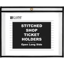 Store and protect work orders, production schedules, inventory cards and more in these stitched shop ticket holders. Strong, rigid, clear vinyl allows easy visibility of your documents. Convenient eyelet at top is perfect for hanging the ticket holders up for easy access. Reinforced stitched edge prolongs product life. Top-loading ticket holders open on the long side and feature a clear front with a black, Pressboard back.